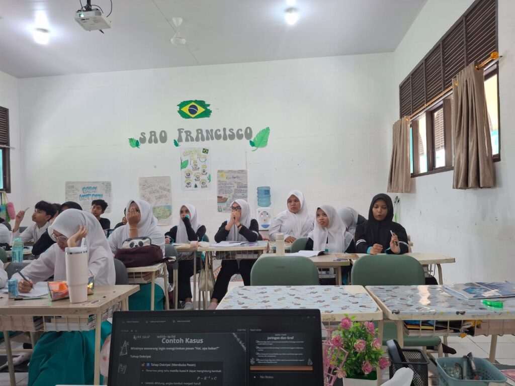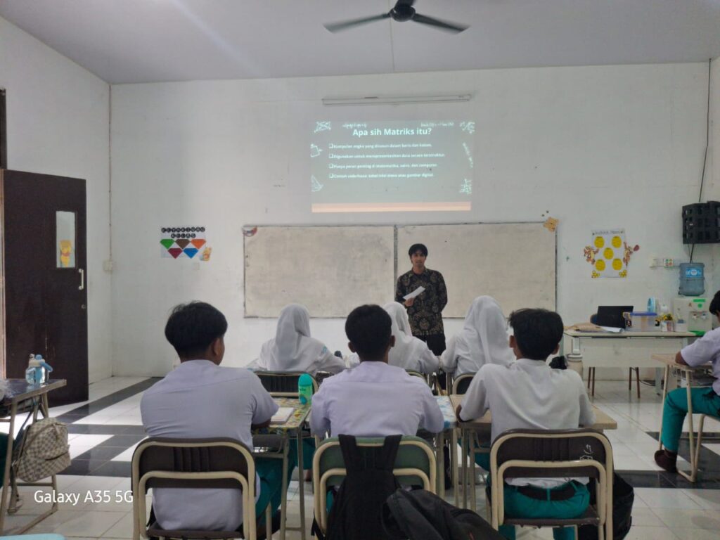 Kegiatan guest teacher pada mata pelajaran Matematika dengan tema “Hubungan Matriks dengan Komputer” berlangsung dengan sangat menarik dan interaktif. Kegiatan ini menghadirkan Muhammad Dzikrullah sebagai guru tamu, seorang mahasiswa yang memiliki pengalaman dalam bidang teknologi informasi dan pemrograman. Sesi ini diselenggarakan dengan tujuan memberikan wawasan kepada peserta didik mengenai bagaimana konsep matriks tidak hanya digunakan dalam perhitungan matematika, tetapi juga menjadi fondasi penting dalam sistem komputasi modern.